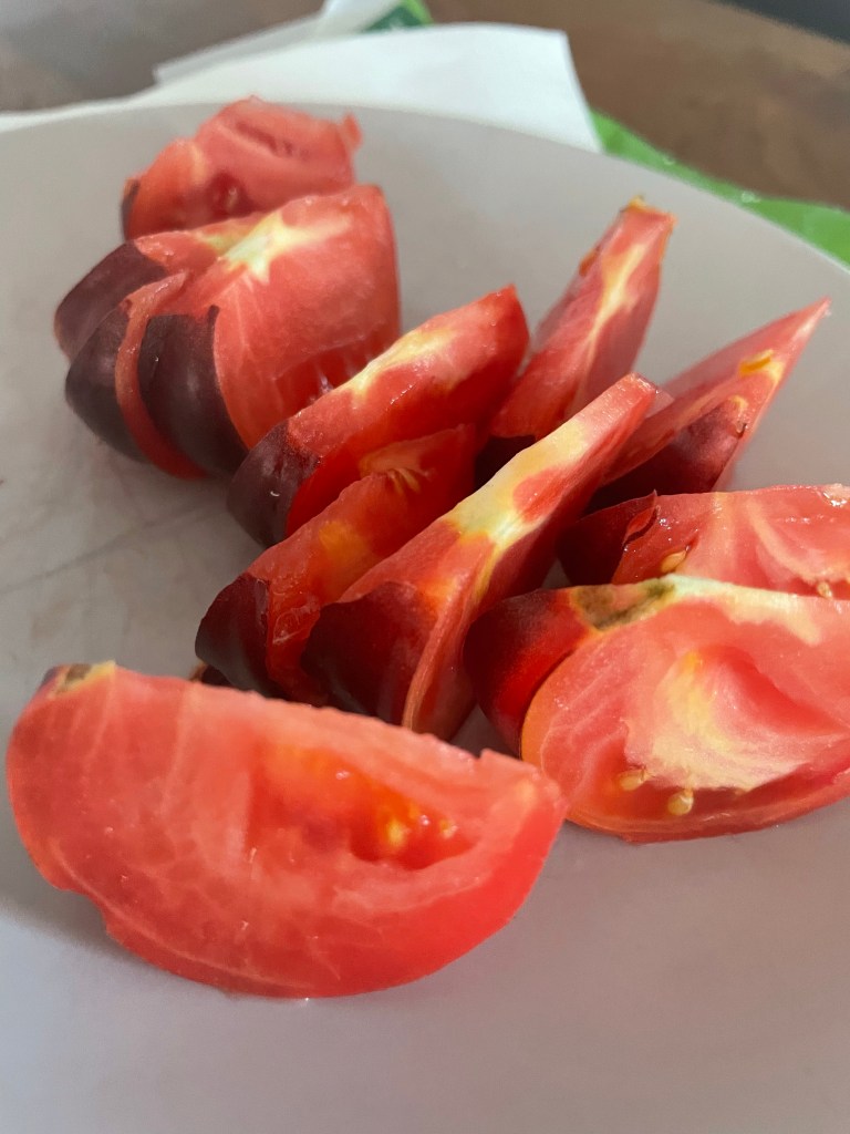 U ovu kategoriju smjestit ću “crne” sorte koje se tako zovu iako nisu crne nego tamnije crvene u prelazu na smeđu sa zagasito maslinasto zelenom kapom te puno mlađe “indigo” sorte koje zaista jesu crne kao dimnjačar. Ove prve su i stare, vremenski, pokrio sam već Kalabaša i Crnog Rusa u kategoriji starih sorti. Suprotno od njih, indigo sorte su vrlo mlade, stare nekoliko godine do možda desetak godina maksimalno. Indigo sorte ponegdje se nazivaju i plavim sortama jer taj crni pigment u kombinaciji s crvenim mesom paradajza daje im neki ljubičasto-plavi odsjaj. Prva indigo sorta razvijena je 2011. na sveučilištu Oregon te po tome nosi ime OSU Blue, gdje je OSU skraćenica od Oregon State University. Dobivena je križanjem paradajza s bliskim srodnikom, divljom borovnicom. Ne radi se GMO sorti, nego o križanju prirodnim putem. Osnovna ideja zbog koje je ovo rađeno bila je da se ubaci antocijan, vrijedni antioksidans, tvar koja daje boju borovnicama, u strukturu paradajza. Antocijan je topiv u vodi, za razliku od likopena, antioksidansa prisutnog u svim paradajzima, koji je topiv u mastima pa uglavnom nije iskoristiv našem organizmu kod konzumacije svježeg paradajza. Ako nekoga zanima detaljnije o toj temi, evo i linka. OSU Blue, prvu indigo sortu razvijenu 2011. godine, sadio sam dvije sezone, atraktivan izgledom onako monolitno crn, al nažalost prilično bezukusan. Kao da ste otišli u Konzum i kupili kilu onog paradajza okusa plastike. Međutim prošlo ljeto naletio sam na nekoliko novih sorti, potomaka OSU Blue i ostao zapanjen, kakav spektakl od paradajza, svakako meni najveće otkriće 2022. godine iz svijeta paradajza. Botaničari širom svijeta isprobavali su križanje OSU Blue s raznim starim sortama, rezultat je nevjerojatan. Sorte poput Ametist Jewel, La Cadero ili Ozark Sunrise, nikada nisam tako nešto probao, intenzivna aroma vrhunskog viskija i dimljene šunke, sve to u jednom paradajzu. Crni geni borovnice potakli su najbolje u paradajzu. Jedva čekam ovu sezonu da se uvjerim da ono lani nisam sanjao, a nabavio sam i neke nove indigo sorte.