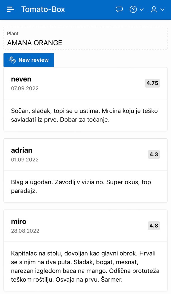 2. Amana orange – veliki žuti paradajz iz Iowe. Umjesto da pišem opis, navesti ću recenzije ove sorte iz moje Tomato-box mobilne aplikacije. Jer kako kome spremim paradajza na kušanje, tako dobije i mobilnu aplikaciju s listom sorti koje je dobio, uz zamolbu da napiše ocjene i utiske. Tako Miro piše “Kapitalac na stolu, dovoljan kao glavni obrok. Hrvali se s njim na dva puta. Sladak, bogat, mesnat, narezan izgledom baca na mango. Odlična protuteža teškom roštilju. Osvaja na prvu. Šarmer”. Adrijan nadodaje “Blag a ugodan. Zavodljiv vizualno. Super okus, top paradajz”. Dok Šaba zbori “Sočan, sladak, topi se u ustima. Mrcina koju je teško savladati iz prve. Dobar za toćanje”. Čini mi se da im se Amana svidjela?